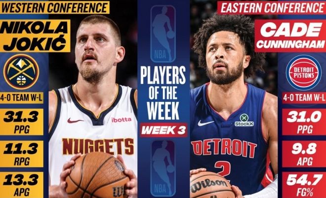 NBA官方公布了第3周的東西部周最佳球員,東部由活塞后衛(wèi)康寧漢姆當(dāng)選,西部由掘金中鋒約基奇當(dāng)選。康寧漢姆上周場均砍下31分+9.8助攻,帶領(lǐng)活塞取得4勝0負的戰(zhàn)績,登頂東部第1!據(jù)統(tǒng)計,這是康寧漢姆生涯第2次拿到該獎項。約基奇上周場均豪取31.3分+11.3籃板+13.3助攻,帶領(lǐng)掘金取得4勝0負的戰(zhàn)績。據(jù)統(tǒng)計,這是約基奇生涯第18次獲此殊榮,隊史最多!值得一提的是,字母哥、杜倫、克尼佩爾、米切爾、鮑威爾、唐斯、布克、亞歷山大、墨菲、蘭德爾和申京等人獲得了周最佳提名。